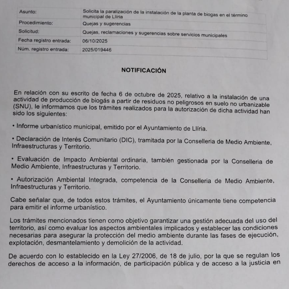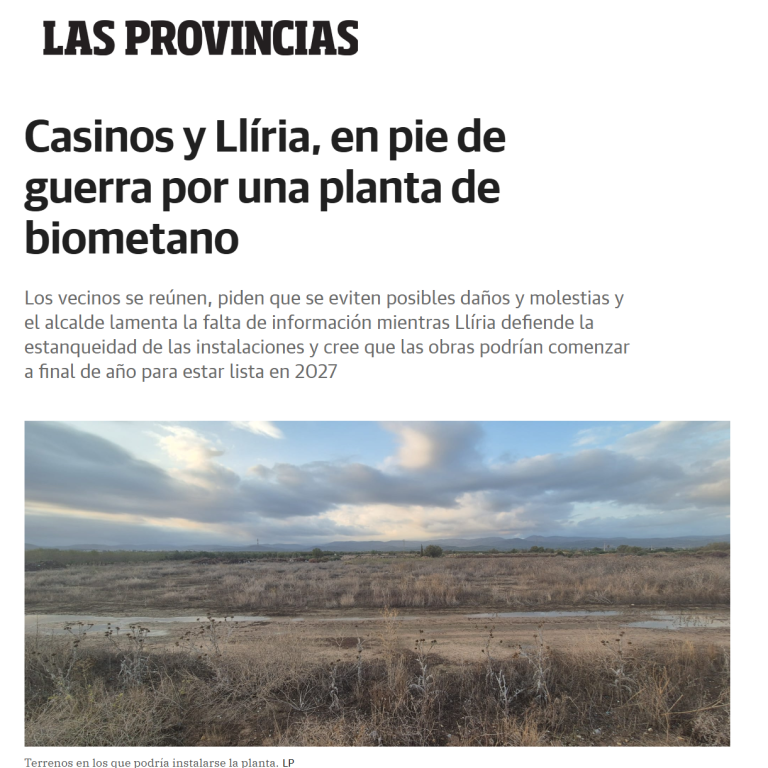 El tráfico pesado, los olores y la contaminación amenazan la calidad de vida en Llíria y municipios vecinos, aseguran. El proyecto de construcción de una macroplanta de biogás en Llíria sigue generando un creciente rechazo entre los vecinos del Camp de Túria. La Asociación Ciudadana Camp de Túria y Serranía denuncia una falta total de información y participación pública en el proceso, asegurando que el Ayuntamiento ha tramitado la iniciativa sin un verdadero debate ciudadano ni acceso a la documentación técnica.